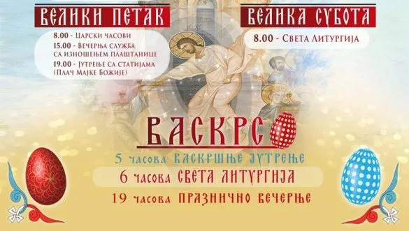 6. АПРИЛ – ВЕЛИКИ ПОНЕДЈЕЉАК 19.00 – Празнично вечерње са петохљебницом 7. АПРИЛ – ВЕЛИКИ УТОРАК (БЛАГОВИЈЕСТИ) 08.00 – Јутрење…