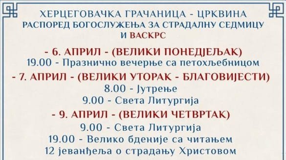 ХЕРЦЕГОВАЧКА ГРАЧАНИЦА – ЦРКВИНА Распоред богослужења за Страдалну седмицу и Васкрс