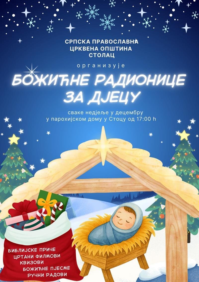 ЦО Столац организовала је Божићне радионице за најмлађе парохијане сваке недјеље у децембру. Дјеца су са вјероучитељицом Зорицом Гојачић имали прилику да читају божићне приче, гледају цртане филмове, израђују божићне рукотворине и посаде божићну пшеницу, те науче неколико пјесмица и забаве се уз квизове. На крају дружења помогли су у кићењу столачког храма. Материјал за рад и средства за слатко послужење обезбиједила је ЦО Столац и Фонд вјероучитеља наше Епархије.