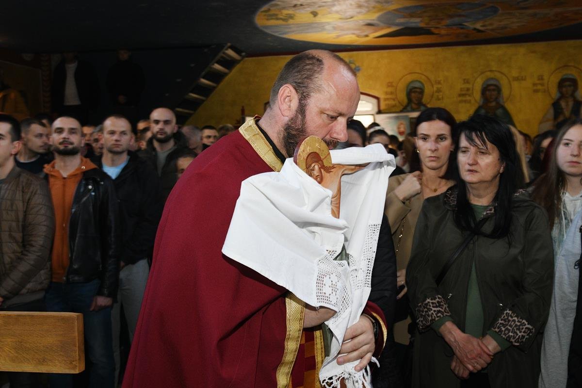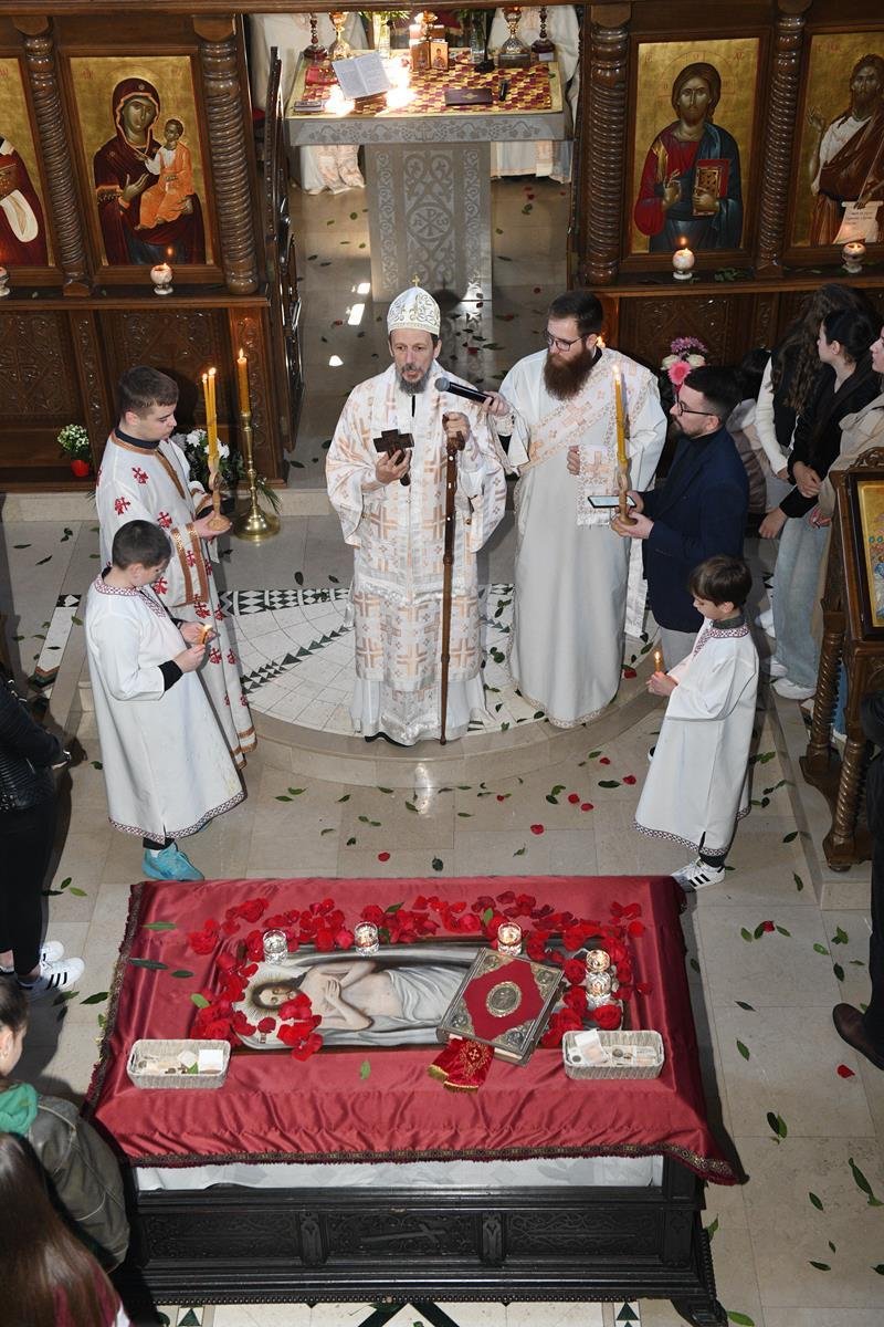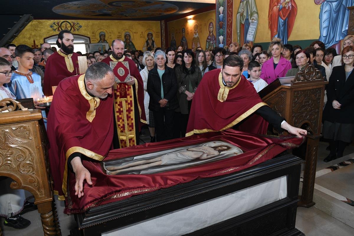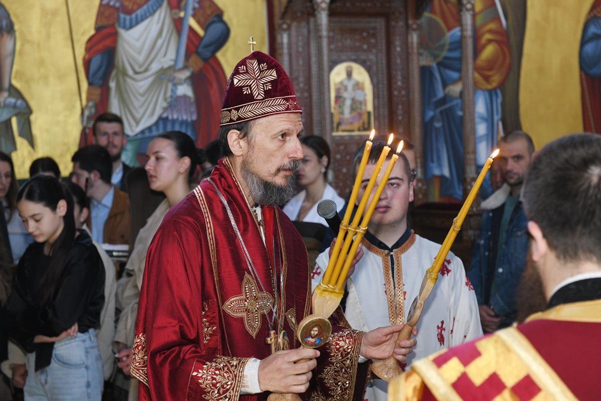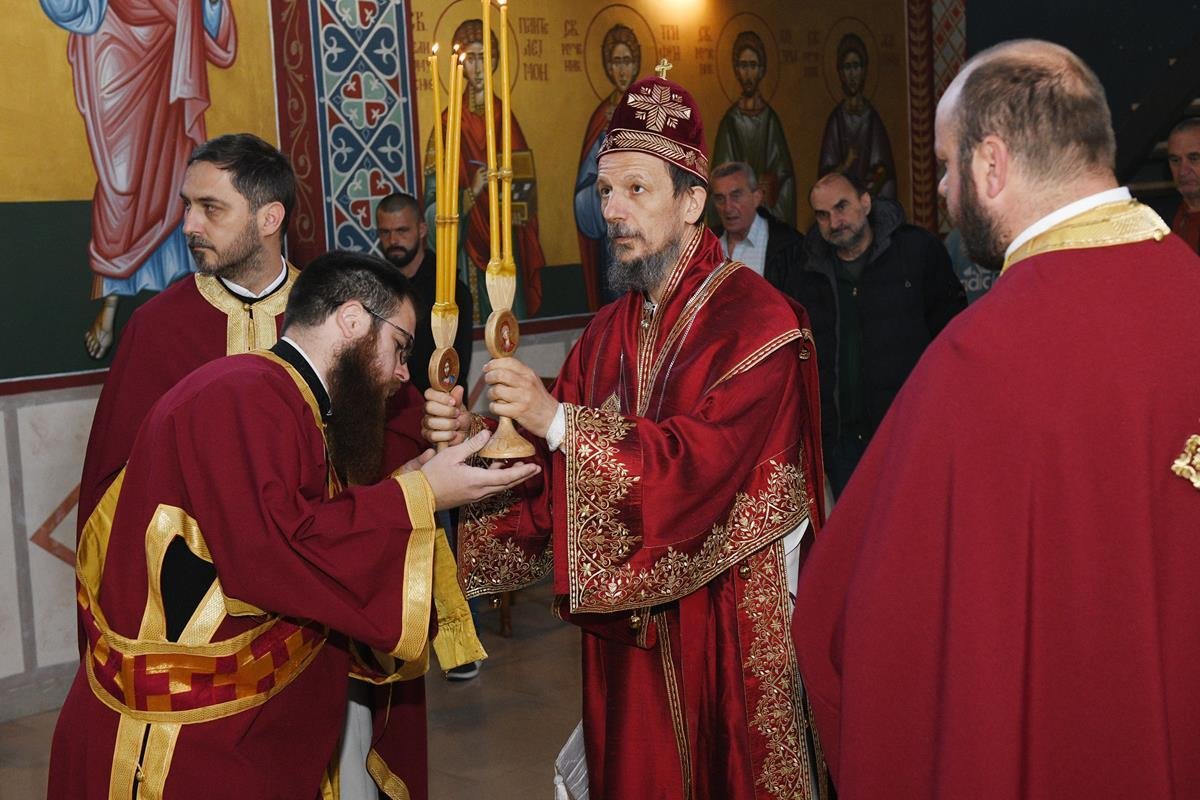 Бесједећи по Јеванђељу, Владика Димитрије нагласио је да за спасење човјека треба читав Бог и читав човјек. Све што људи раде, све што је добро, треба да чине читавим бићем и онда ће Бог Духом прострујати кроз човјеково биће и они ће се осјетити као Божији људи. Потребан је читав човјек, јер је такав Бог који се људима предао до краја. Бог је човјека створио као дијете љубави и увео га у живот Свете Тројице, а након што је човјек отпао од те љубави, Он шаље Сина Јединородног, да би показао човјеку колико га воли, како је неодступан од своје љубави и како би опет потврдио своју љубав, само ако човјек жели да се косне те љубави. Тајна Велике суботе, окупљање око живоносног Христовог гроба, је тајна хришћанског живота. Свијет иде, људи траже испуњење у материјалном, у стицању и богатству, а у срцу сваког правог хришћанина обитава Христос. Као положен у гроб, Он само спава тијелом својим, а већ објављује и позива у васкрсење све који су умрли. Када је васкрсао, сишао је у ад и позвао све праведнике од постања свијета, а и данас позива праведне душе, јер је Он живи Бог и више нема таме, нити ичег Њему недоступног.