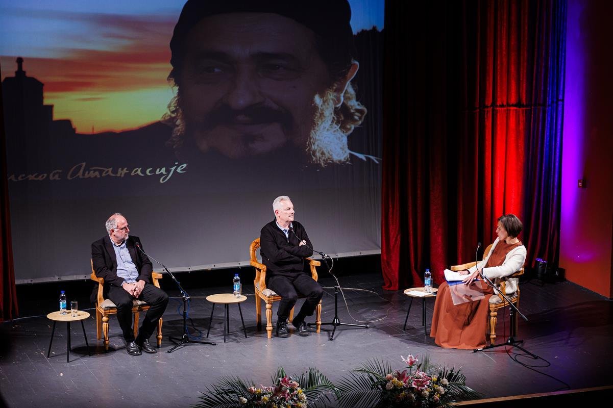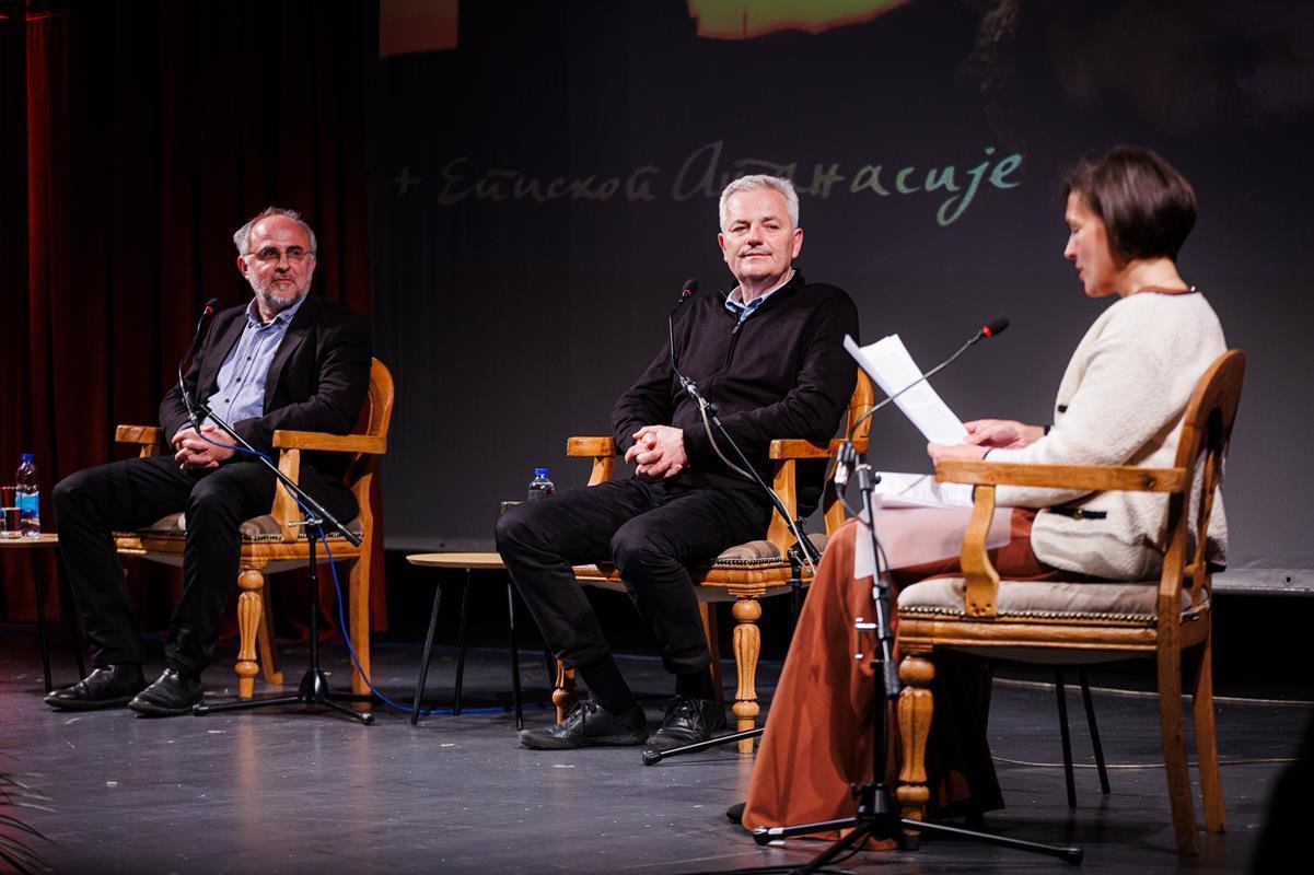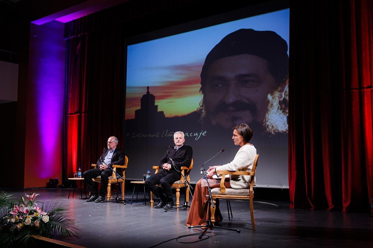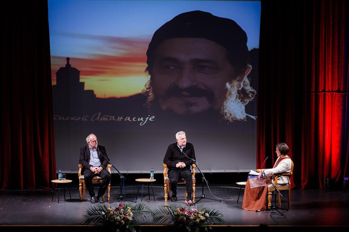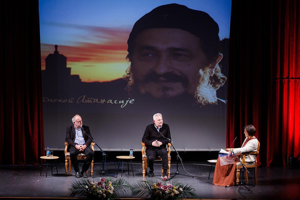 У наставку вечери, у позоришној сали Културног центра, одржана је прва сесија разговора под називом “Обнова Тврдоша – почетак обнове светосавске Херцеговине”. Умјесто оправдано одсутне мр Иване Грујић, директорке Музеја Херцеговине у Требињу, говорнике и госте поздравила је др Ведрана Авдаловић, која је била свједок археолошких истраживања и учесник обнове Тврдоша. Најприје је прочитано обраћање мр Иване Грујић, а затим приказано обраћање проф. др Љубише Фолића, који није био у прилици да допутује у Требиње. Некадашњи студенти на стручној пракси у Требињу, а данас угледни научници доц. др Дејан Радичевић и др Дејан Булић подјелили су с присутном публиком сјећања на студентске дане и вријеме проведено уз Владику Атанасија.