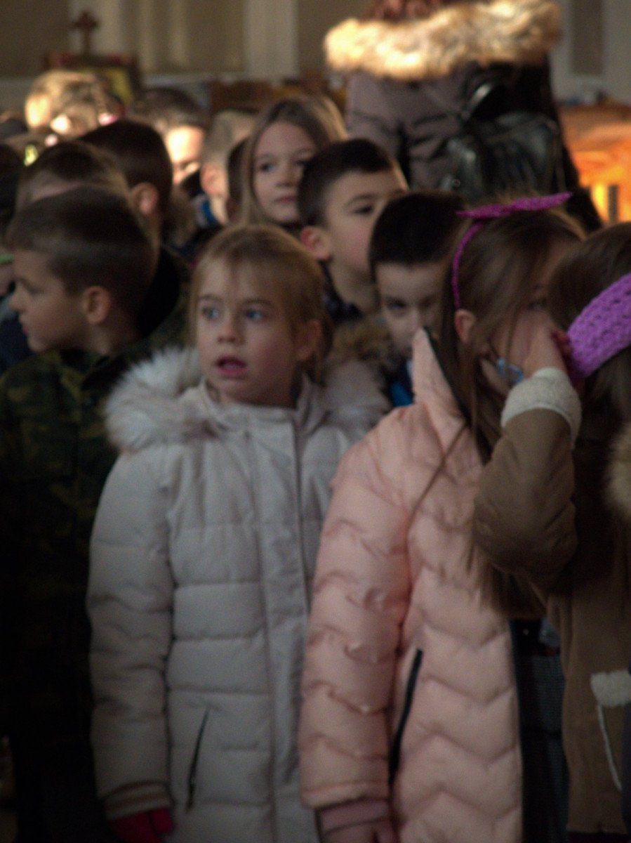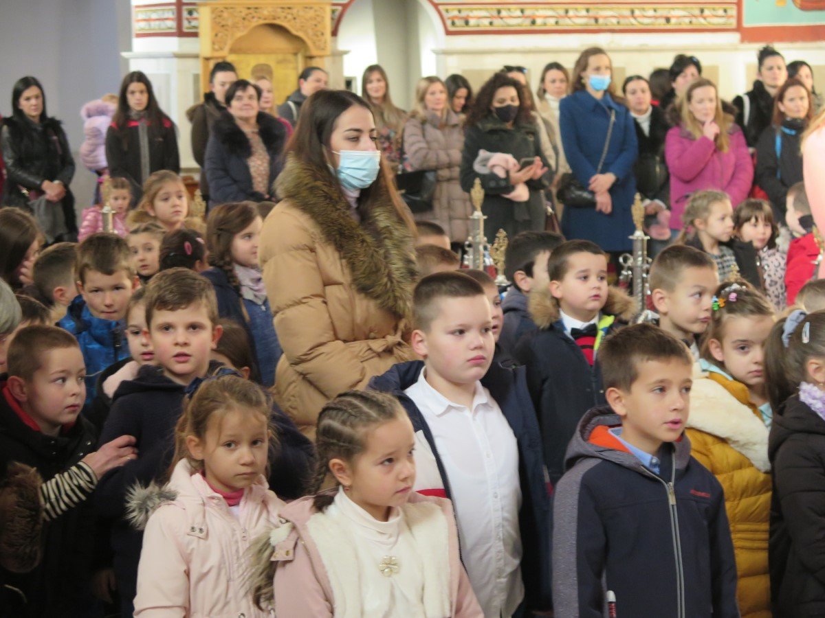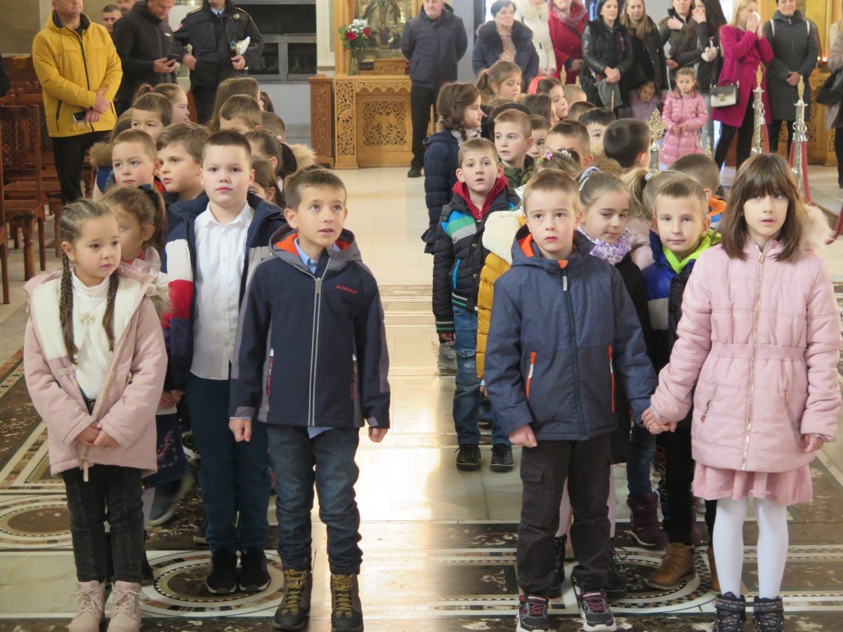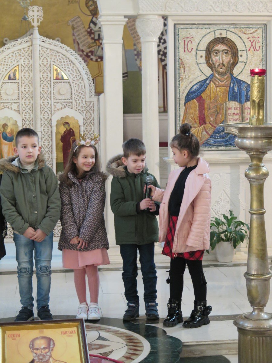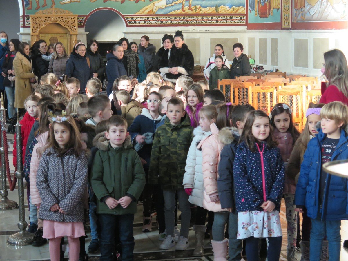 Јутрос су ученици првог разреда ОШ ,, Вук Караџић“ у пратњи својих учитељица посјетили Саборни храм у Требињу. Старјешина храма, о. Младен Жуловић, им је пожелио добродошлицу и поучио их причом о св. Николају. Након тога су најмлађи ђаци са амвона низали пјесмице и рецитације о најдражем дјечијем светитељу које величају доброту, милосрђе и љубав. По завршетку своје кратке приредбе окитили су први бадњак украсима које су брижљиво припремили у школи. Да претпразничка радост буде потпуна побринуо се о. Младен, припремивши никољданске слаткише.