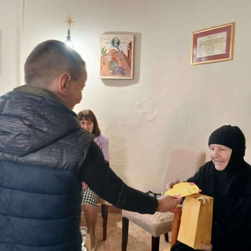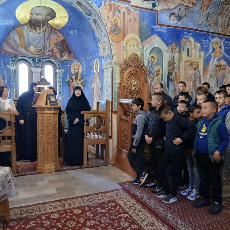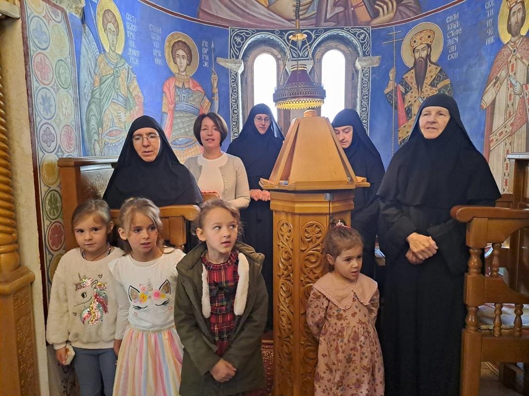 Након службе, сестре монахиње су припремиле послужење, током којег су ученици кроз песму и рецитације најавили радосне дане Васкрсења. Овом приликом ученици су игуманији мати Павли предали васкршње честитке, које су са великом пажњом и љубављу припремили за сестринство овог светог манастира.