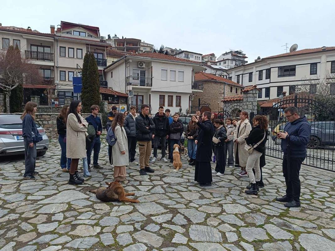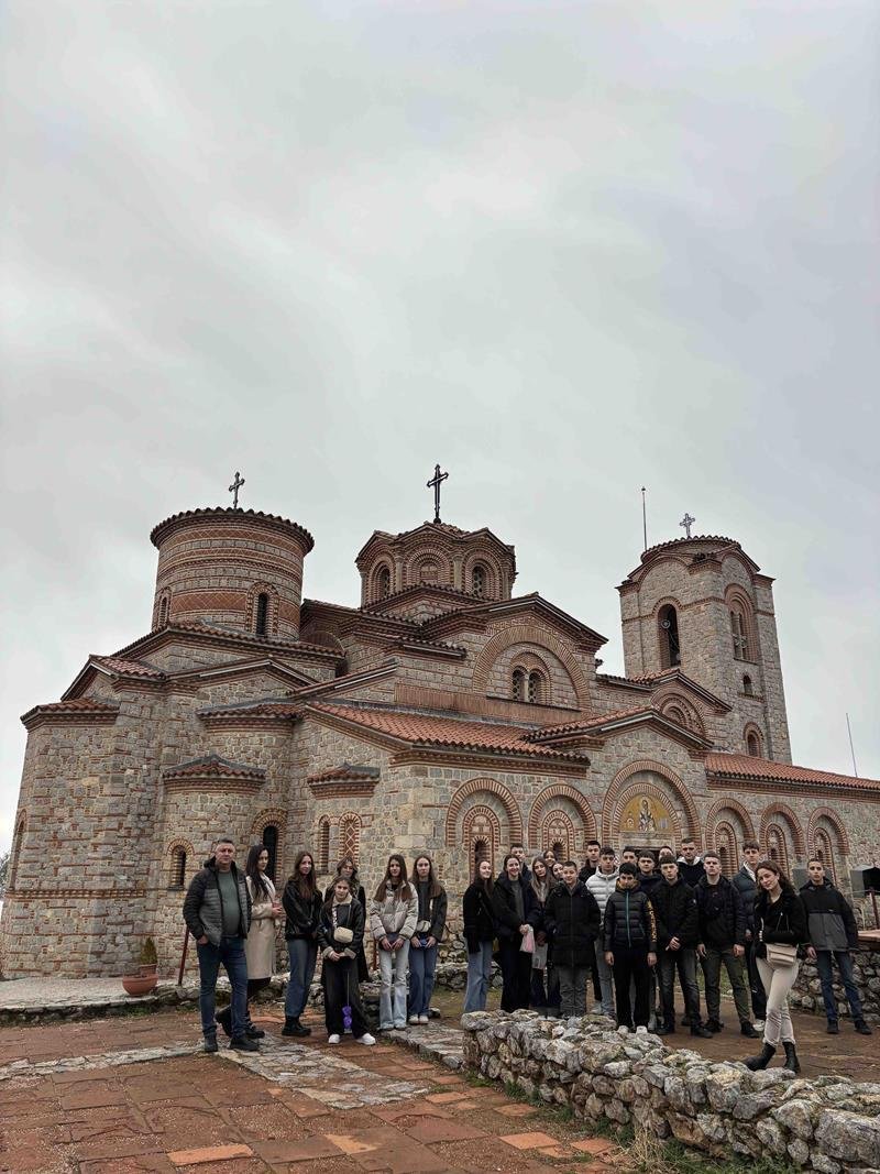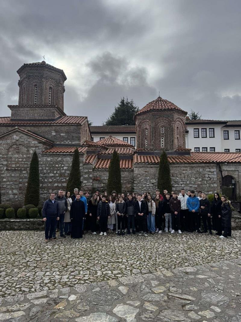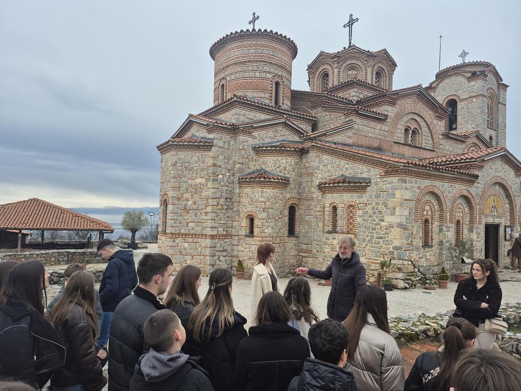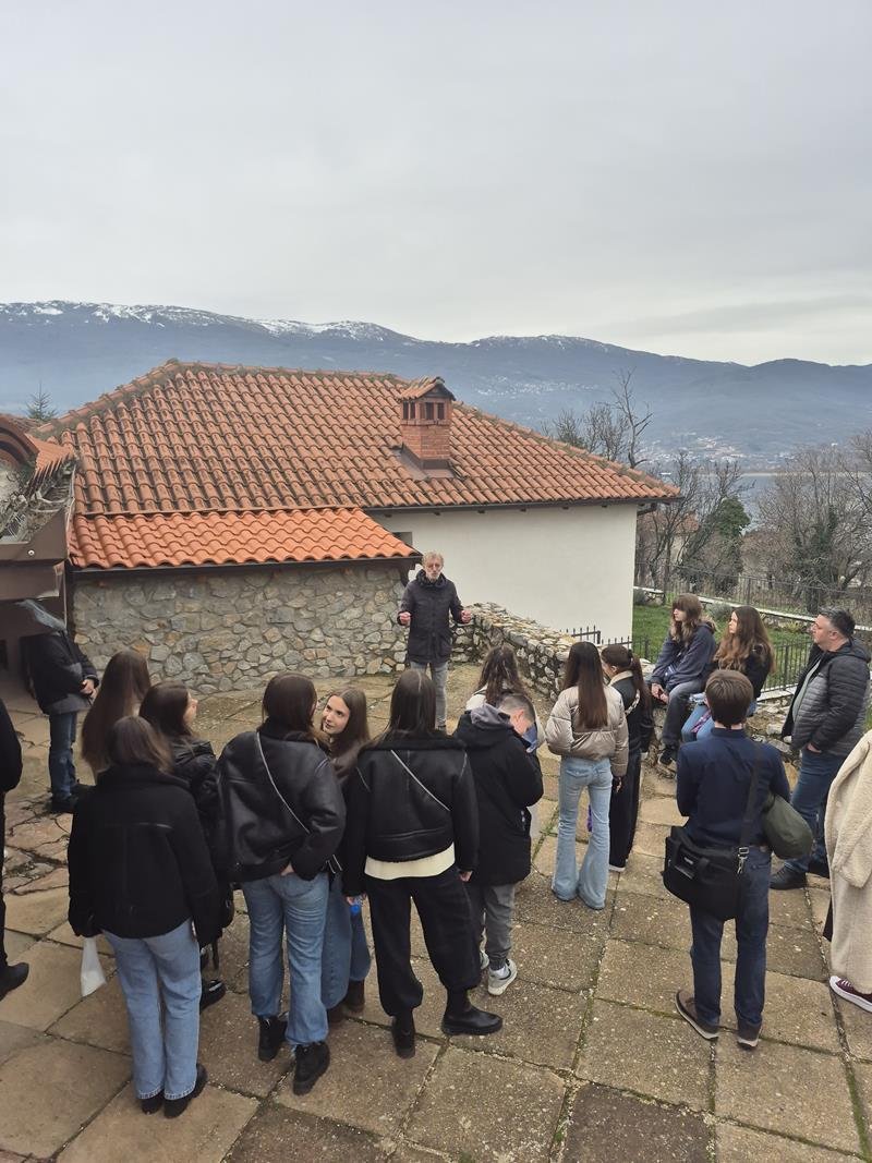 Група је у наставку обишла и Храм Светог Климента и Пантелејмона који је реплика старог храма из 9. вијека који је саградио Свети Климент Охридски и у њему био сахрањен. Вјерује се да је управо у овом манастиру Свети Климент учио своје монахе да преписују Свето Писмо на старословенски језик, ћириличним писмом. Овај храм претрпио је велика страдања за вријеме османског периода, био претворен у џамију, а данас је обновљен и у њему се чувају светитељеве мошти. Такође, у близини ове светиње налази се крстионица из 4. вијека и остаци античког града са чијом историјом је ученике упознао и стручни водич.