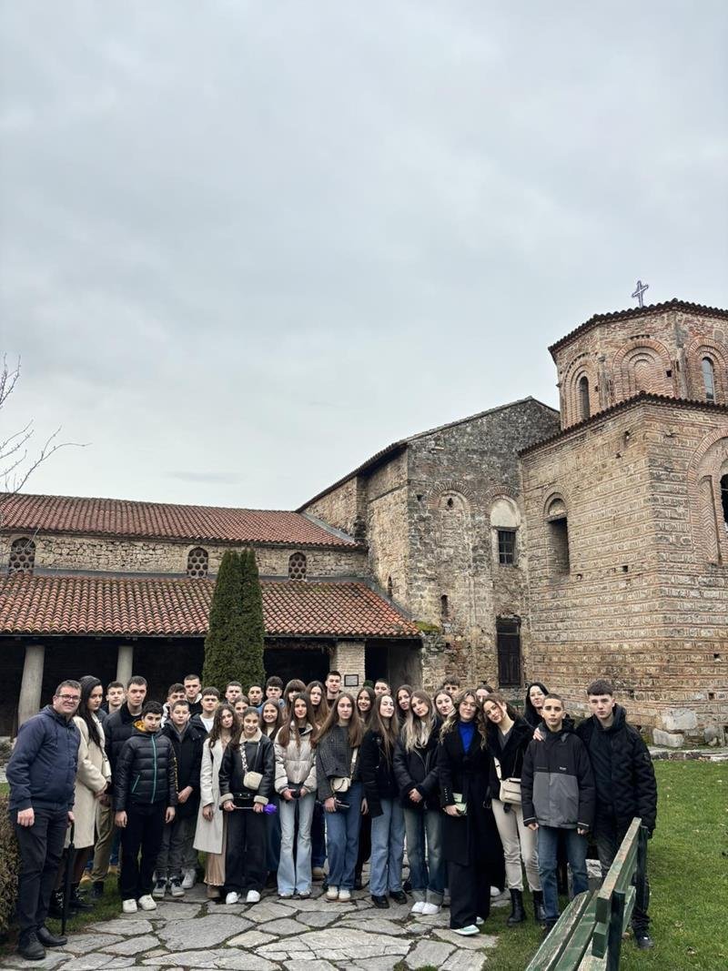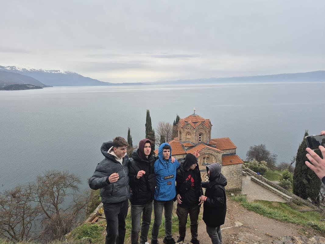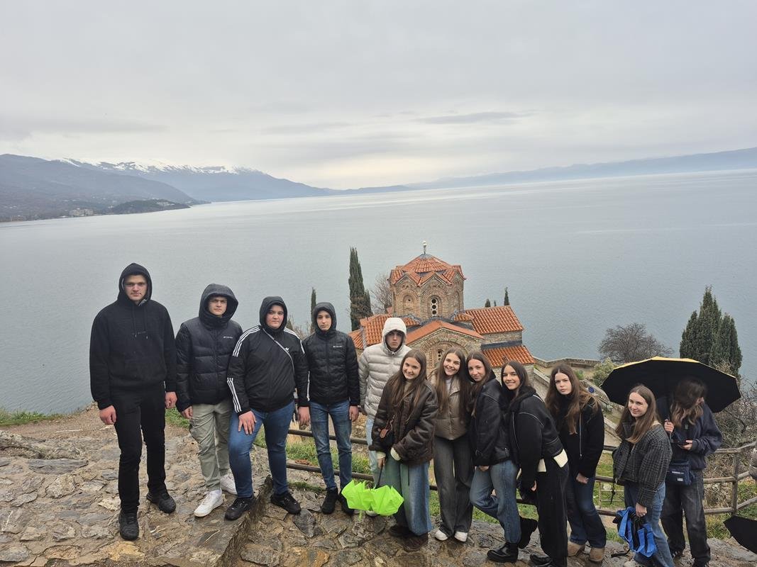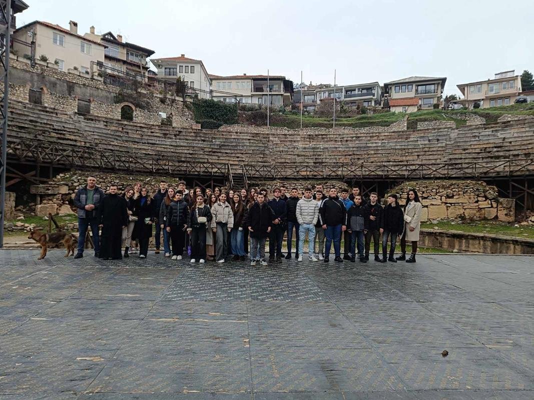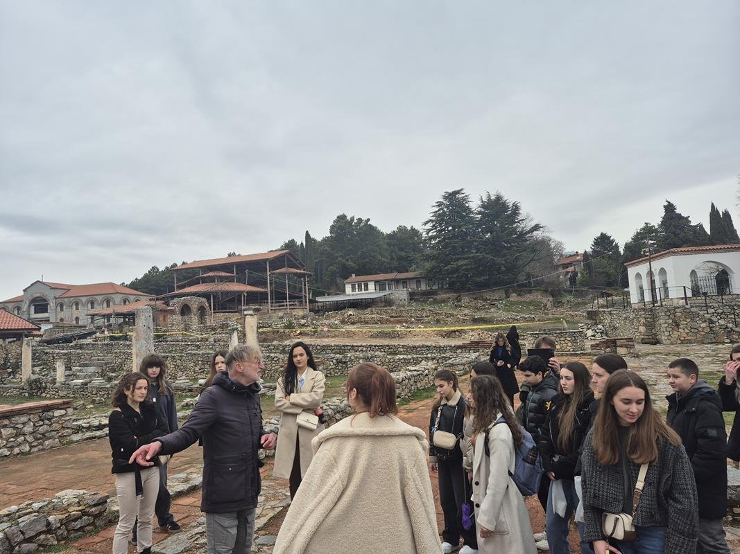 Група је у наставку обишла и Храм Светог Климента и Пантелејмона који је реплика старог храма из 9. вијека који је саградио Свети Климент Охридски и у њему био сахрањен. Вјерује се да је управо у овом манастиру Свети Климент учио своје монахе да преписују Свето Писмо на старословенски језик, ћириличним писмом. Овај храм претрпио је велика страдања за вријеме османског периода, био претворен у џамију, а данас је обновљен и у њему се чувају светитељеве мошти. Такође, у близини ове светиње налази се крстионица из 4. вијека и остаци античког града са чијом историјом је ученике упознао и стручни водич.