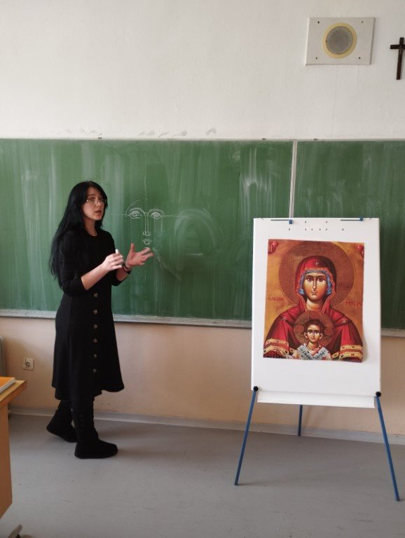 Презвитера Босиљка је прво ђаке увела у теологију иконе, која је и потврђена Сабором 843.г. у Цариграду, а том приликом је истакла: да су иконе прозор у ” горњи свијет”, преко кога нас посматрају Богородица и сви свети; иконе нису предмет декорације, већ позив на молитву; иконе су веза између онога ко се моли, Бога, Богородице и светитеља; иконе спајају видљиво са невидљивим и преко њих ми поштујемо онога ко ке приказан на њима; икона није портрет – нема намјеру да тачно представи човјека, јер не можемо ни знати како су одређени светитељи изгледали у древности, већ се приказују у новој, преображеној слави; светитељи су ти који су испунили задатак који је Бог дао свима нама – да будемо боголики, јер смо створени по слици и подобију Божијем. Кроз рад је нагласила да смо сви призвани да будемо светитељи кроз заједницу са Богом.