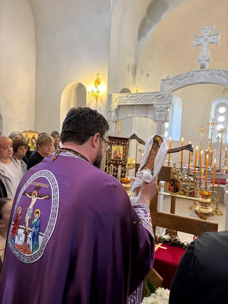 На Велики петак, Кирилометодијевском храму у насељу Тини, служена је вечерња служба са изношењем плаштанице и јутрење са статијама.